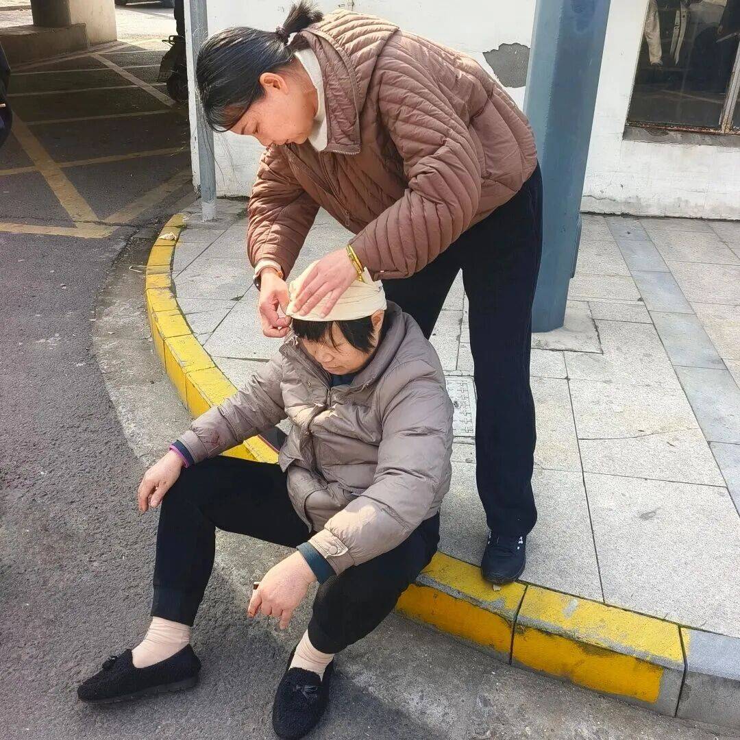 只见马路中央,一辆私家车和电动车撞在了一起。一位大妈满头鲜血,坐在一旁,双手扶着脑袋,神情恍惚,不知所措。徐晶见状,立刻返回店内取出急救包,再快速返回现场。她先仔细查看大妈的整体受伤情况,在确认大妈意识清醒且没有骨伤后,将她小心翼翼地扶到安全地带,避免二次伤害。紧接着,凭借着专业的急救知识,她用纱布为大妈紧急按压止血,随后取出医用三角巾,熟练又细致地为大妈进行包扎。