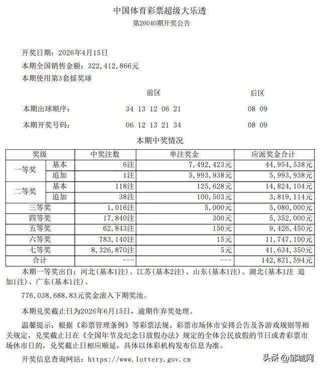 2026-04-19彩票,彩票平台,彩票网站,彩票APP下载,六合彩,快三邹城网4月16日讯,恭喜!山东济宁在4月15日晚开奖的超级大乐透第26040期中,斩获了1注基本投注头奖,单注奖金高达7,492,423元(约749万),是本期山东地区唯一的中奖地。